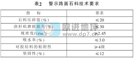 骨料必须色彩鲜明、耐磨、棱角性好,且粒径分布均匀,以3mm~5mm粒径为佳。彩色警示路面所用粗集料应该洁净、干燥、无风化、不含杂质。力学性质应符合相应道路等级的要求,具体石料技术要求如表2所示。