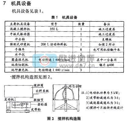 b.拌和:拌和采用0.2 m 强制式砂浆搅拌机,搅拌机可参考“7机具设备”中的示意图加工制作。按骨料,水泥,外加剂,水的顺序依次加入搅拌筒内,每盘可投入150 kg水泥,搅拌必须均匀,搅拌时间不少于2 min。C.摊铺:待C35混凝土初凝前后,立即开始摊铺面层拌和料;并在C35混凝土终凝前,完成第一次人工压光。