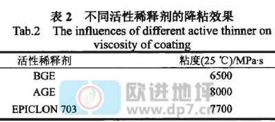 从表2数据可以看出:BGE的降粘效果最好,AGE的降粘效果和EPICLON 703的降粘效果相当,采用EPICLON 703制备的涂料其粘度也满足了无溶剂环氧自流平地坪涂料对粘度的要求。