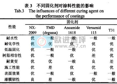 环氧树脂本身是一种热塑性高分子,单纯的环氧树脂本身并没有多大的价值,只有加入固化剂使它转变为三维网状立体结构,才能呈现其优异的性能。目前无溶剂自流平地坪涂料使用的主要固化剂有脂肪胺及其加成物、脂环胺及其加成物、聚酰胺及其加成物、酚醛胺等。通常选用的固化剂中应该含有抗白花、耐酸、低温固化(5~10℃)、耐黄变、抗水斑的成分,以避免无溶剂环氧自流平地坪涂料在低温、高湿的环境下施工可能出现的油斑和白花现象,因此固化剂的选择至关重要。试验中采用了五种固化剂,分别与同一色漆搭配制备涂膜,观察了它们对涂膜性能的影响,结果见表3。