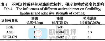 2.6不同活性稀释剂对漆膜柔韧性、硬度和粘结强度的影响通过上述树脂、固化剂、助剂和颜填料的选择,我们得出了优化后的无溶剂环氧自流平地坪涂料配方。以此配方为基础,保持其它条件不变,仅改变活性稀释剂的种类,分别以BGE、AGE、EPICLON 703为活性稀释剂制备了三个色漆(A组分),然后,采用NX.2009作为固化剂(B组分)分别制备涂膜,并测定它们的柔韧性、表面硬度以及与水泥基面的粘结强度,测试结果见表4。