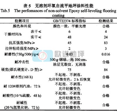 按照优化后的配方,采用环保型活性稀释剂EPICLON 703制备无溶剂环氧自流平地坪涂料,并按国标方法检测其各项性能,多次重复试验的测试结果重现性好,所制备涂料的各项性能达到或高于国标规定的指标,检测结果见表5。