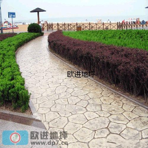 浇筑压膜混凝土施工——压膜混凝土施工初凝时撒布彩色渗透强化干粉(压膜粉),并使之抹平——撒布彩色脱模粉——模具压花——除去脱模粉——养护——封闭剂(界面剂)——密封保护