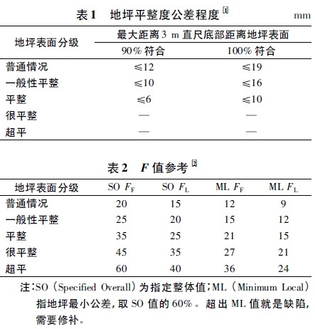 业主提出的检测标准一般都是美标,根据美国混凝土协会ACI 117—90 对地坪平整度FF和水平度FL的技术要求,以及美国材料试验协会ASTME1155 m 的参考值,见表1、表2。