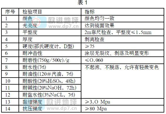 环氧地坪必须符合《中华人民共和国化工行业标准》(HG/T3829-2006)的技术要求。施工完成后,应对成品进行质量检测,各项检测应合格。检测项目及要求见表1。