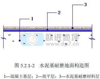 5.2.1现浇混凝土水泥基耐磨地面的构造应由混凝土基层、水泥基耐磨材料层构成(图5.2.1-1)或由混凝土基层、找平层及水泥基耐磨材料层构成(图 5.2.1-2)。