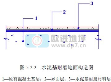 5.1.4现浇混凝土水泥基耐磨地面面层厚度不应小于 1.5mm 且耐磨材料用量不应少于 5kg/㎡,原有混凝土上的水泥基耐磨地面面层厚度不应小于 3.0mm 且耐磨材料用量不应少于10kg/㎡。