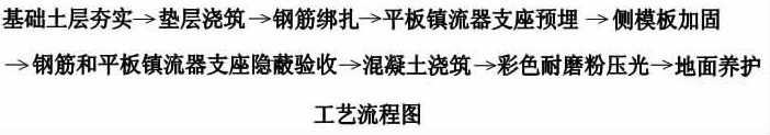 工业厂房的地面一般会在钢结构吊装后进行, 基础土层要夯实,碾压, 垫层施工后进行钢筋绑扎, 根据地面承载力的要求不同, 配筋设计区别很大, 有单层网片筋, 也有双层双向钢筋, 钢筋排布越复杂要求地面混凝土保护层厚度精确程度越高, 该厚度偏大偏小都会造成裂缝产生。由于地面初步收面要使用平板镇流器, 所以要在垫层上固定支座,支座的高度误差决定了地面平整程度, 最后是地面的侧模板支撑, 在钢筋和平板镇流器支座隐蔽验收合格后方可进行混凝土浇筑。在混凝土初凝前进行耐磨粉的压光, 一般压光机收面时间比较长, 大约在6~8 小时, 边角处还需要人工撮面, 温度控制在18~22 度为宜, 彩色耐磨粉含量每平米不低于5 公斤, 厚度不小于3mm, 耐磨粉铺撒不均会导致很强的色差。