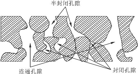 从表1 可以看出,设计孔隙率与实测孔隙率存在着一定的差异,且设计孔隙率越小,实测孔隙率与设计孔隙率的比值越小,数值相差越大。透水混凝土内部孔隙示意图如图2 所示,透水混凝土的内部宏观孔隙分为连通孔隙、封闭孔隙及半封闭孔隙3 种,其中对透水混凝土透水性能有贡献的只有连通孔隙;透水混凝土的设计孔隙率较小时,配合比中胶凝材料用量较多,胶凝材料用量的增加提高了透水混凝土内部封闭孔隙与半封闭孔隙形成的几率,即造成的封闭孔隙与半封闭孔隙越多。