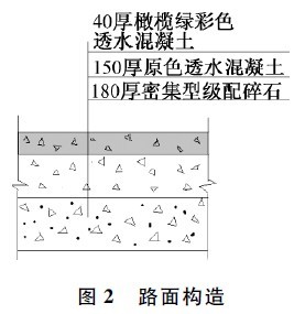 由于透水性混凝土是不含细骨料的多孔混凝土,要配制弯拉强度≥4MPa( 抗压强度≥35MPa) 的透水性混凝土有一定困难。为降低建造成本,采用底层原色透水性混凝土,面层彩色透水性混凝土分层设计方法。由于面层只有40mm 厚,若按常规方法分层浇筑混凝土,面层混凝土与底层混凝土黏结强度较难保证。